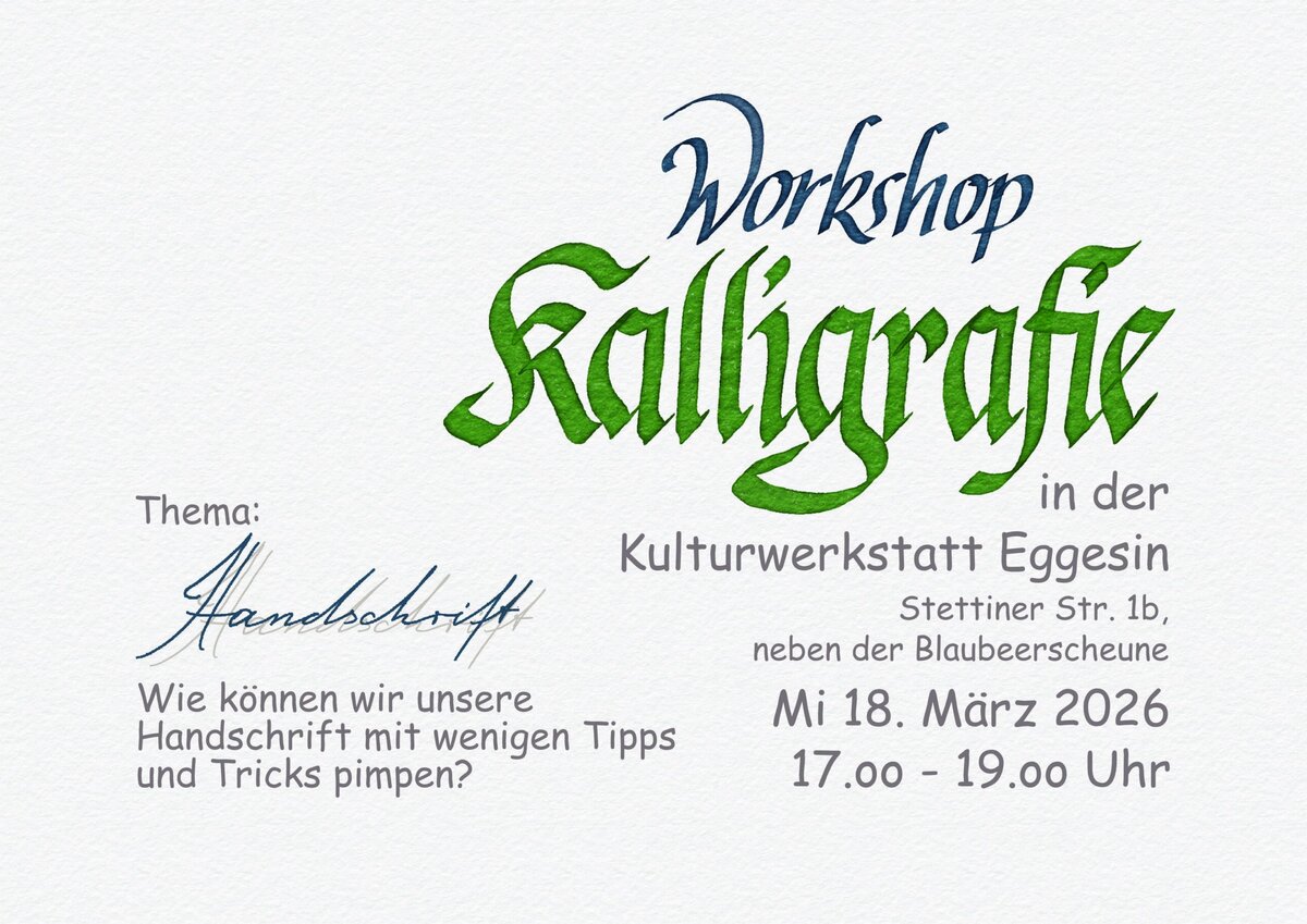 Nun soll Endich ein neuer Kalligrafie-Workshop in Eggesin starten: Am Mittwoch den 18. März treffen wir uns endlich wieder und wollen uns diesmal mit unserer Handschrift beschäftigen. Die Frage ist: Wie können wir sie kalligrafisch einsetzen? Ein Beispiel für eine kalligrafisch eingesetzte Handschrift findet du hier: https://papierkunst.info/die-feder/
